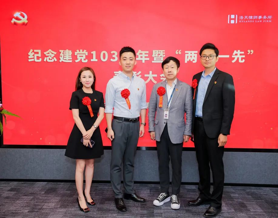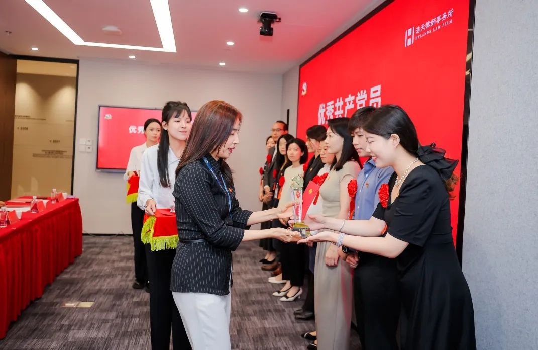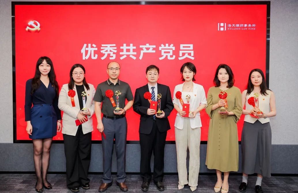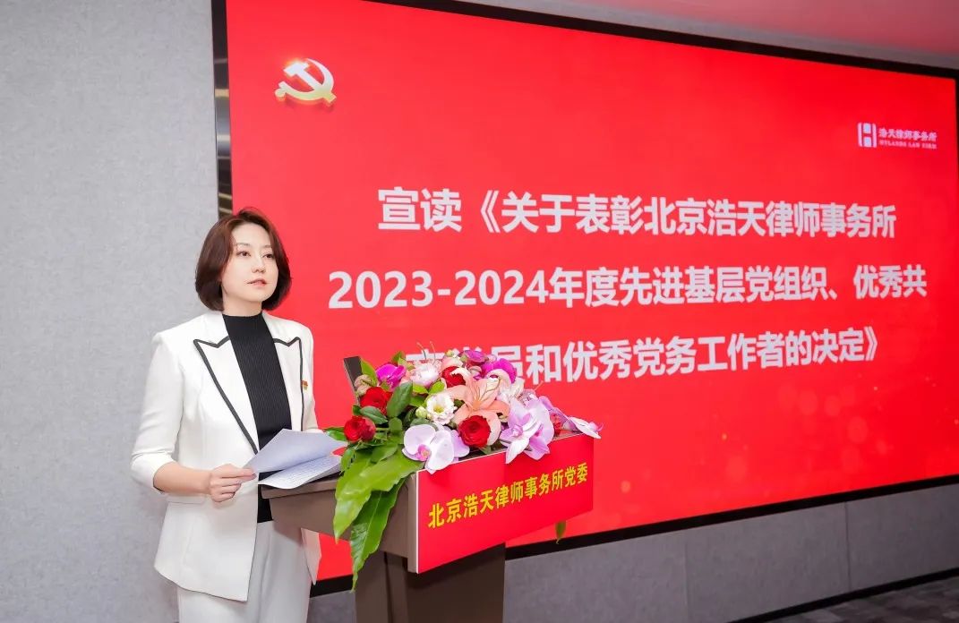 徐羽同志充分肯定了浩天党组织建设和党员队伍建设取得的成效。他指出,浩天党委成立以来,以加强党委班子自身建设、加强党内基本制度建设、加强党支部政治功能和组织力建设、加强党员党性教育为重要切入点,党建机制高效顺畅,党的制度大力夯实,党的组织有效覆盖。实现了党建引领下各方面工作的有效提升。2023年到2024年,律所规模不断扩展、结构不断优化、业绩稳中有进。今年5月份,律所首次颁布了五年度《社会责任报告》,首次编印了《浩天党委党内制度汇编》。在党建工作上,逐步形成了“引领靠班子、管理靠制度、公益强赋能、首都带地方”的浩天特色党建 。广大党员在业务领域、行业领域、“万民党员律师助社区,人民满意我先行”等法律公益服务方面法义承载、不忘初心,行业美誉度、专业知名度、群众满意度不断提升。党员律师已成为律师队伍的一支重要骨干力量,为浩天律所发展做出了重要贡献。徐羽同志代表党委对受到表彰的个人和组织表示衷心祝贺!对奋战在律师一线的全体党员致以衷心感谢!