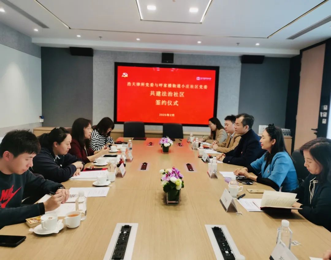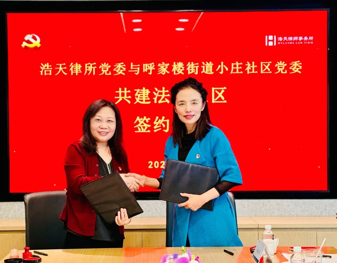 今年是浩天律所党委第四次与小庄社区党委签订“结对共建法治社区”协议。签约仪式暨座谈会是律师面对面倾听社区声音的一次重要渠道和机会,是以实际行动贯彻“万名党员律师助社区,人民满意我先行”的具体体现。签约仪式前,律所根据实际对协议内容进行了认真审视和完善,尤其对工作方式进行了进一步补充。提出了建立团队负责制以保障服务工作稳定性和可持续性;通过走访社区、召开座谈会等方式听取社区居民阶段性法律诉求,制定有针对性的法律服务意见;根据社区需求,参加但不限于法律服务的公益服务;通过社区“邻里节”、“公益大集”等平台,拓宽公益服务渠道和内容;建立社区党组织与律所党组织联系沟通机制,对党的建设、法治建设进行交流 、沟通、分享和合作,发挥双方资源优势,提升党建和基层治理水平等内容。