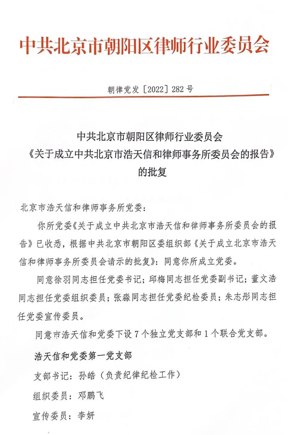 2022年10月14日,经中共北京市朝阳区律师行业委员会批准,中共北京市浩天信和律师事务所委员会正式成立。