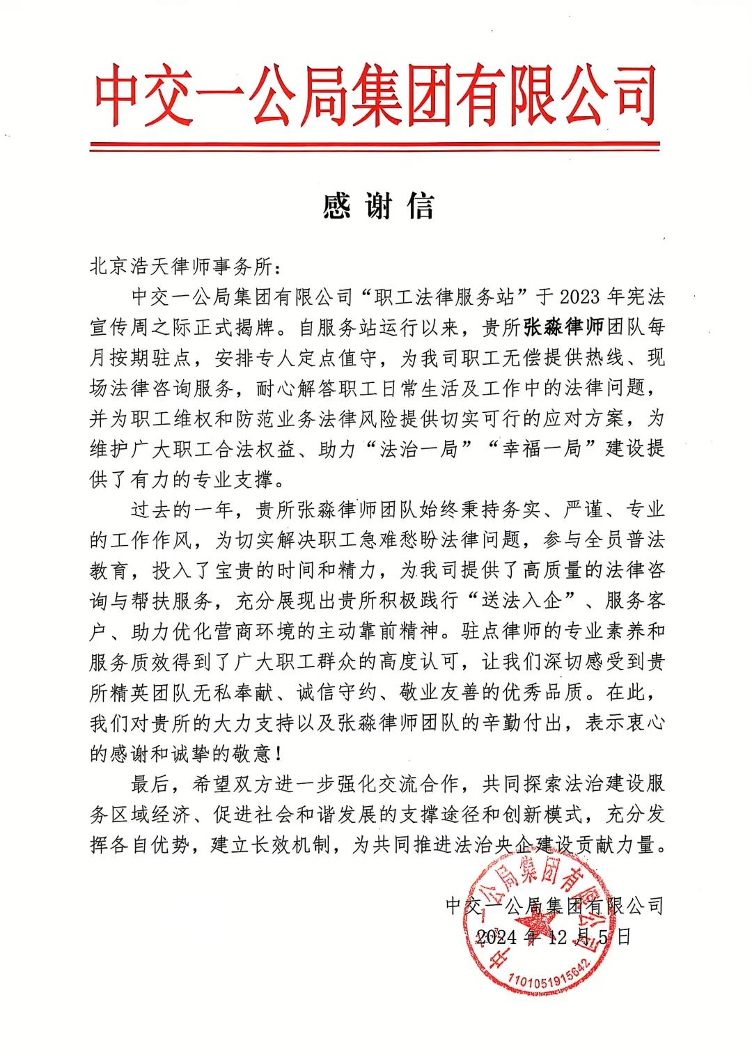 2024年12月5日,中交一公局集团组织开展“职工法律服务站”开放日暨宪法宣传周交流座谈会。北京vsport体育张淼律师团队受邀参加活动。中交一公局总法律顾问、首席合规官许恩信主持会议,全面总结公司职工法律服务站过去一年运行情况,现场宣读并为驻点律所律师代表赠送了感谢信。
