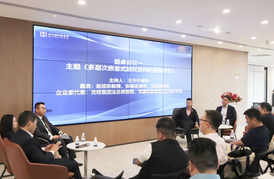 主题演讲环节结束后,由浩天深圳高级合伙人王宁宁律师主持第一场圆桌会议,会议议题为“多层次嵌套式股权结构的是是非非”,参与嘉宾有浩天高级合伙人、仲裁员张继志律师,浩天上海高级合伙人、管理合伙人王悦建律师,参与研讨企业家代表有光明集团法务总监柳雅莉,帝富投资集团总经理孙有斌。会议首先播放了由数字人小天介绍的主题背景,与会嘉宾及企业家代表围绕股权架构设计“三大派系”及“三类股东”问题分别发表了不同的观点,最终大家的观点趋于认同股权结构作为一个工具是为了实现股东需求与政府监管要求的匹配,其带来的法律风险也是企业与股东需要注意的问题。现场讨论气氛热烈,观点层出不穷。