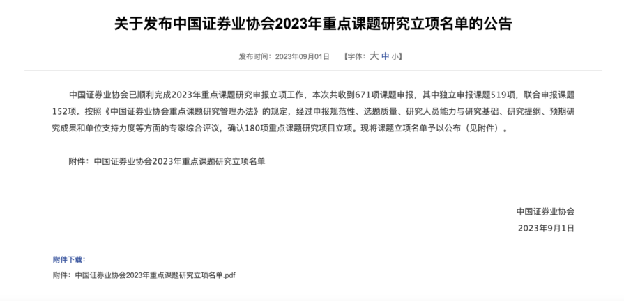 2023年度中国证券业协会重点研究课题主题为“建设中国特色现代资本市场,推动证券业高质量发展”,共收到671项课题申报,续创历年新高。申报课题经过申报规范性、选题质量、研究人员能力与研究基础、研究提纲、预期研究成果和单位支持力度等方面的专家综合评议,最终确认180项重点课题研究项目立项,较去年的183项有所减少。