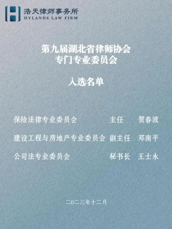 依据2023年12月1日湖北省律师协会召开的第二次常务理事会和2023年12月22日召开的第四次会长办公会,最终审议通过了各专委会组成人员名单,其中浩天武汉办公室贺春波、邓南平、王士永3名律师分别入选第九届湖北省律师协会各专业委员会主任、副主任、秘书长。