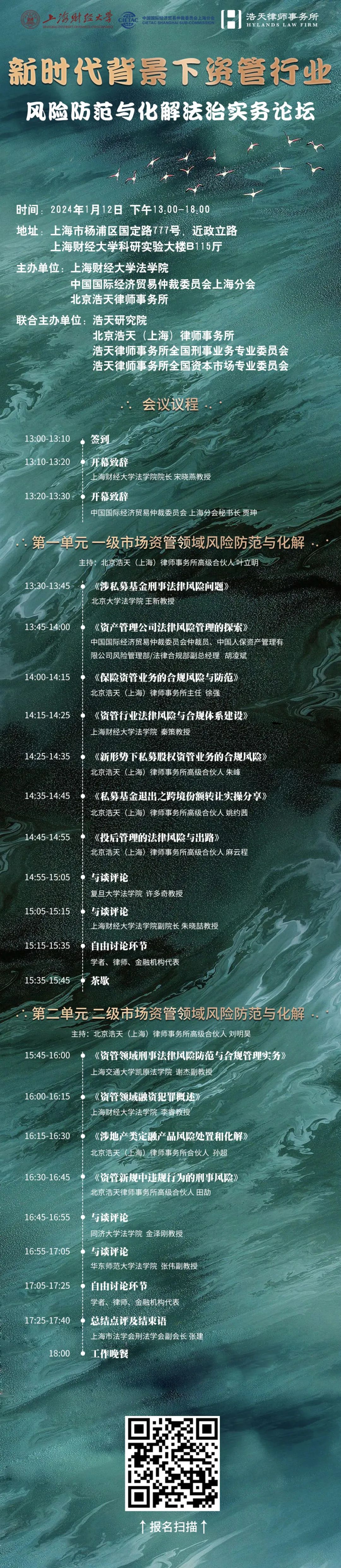 近年来,随着证券市场、房地产市场的不断低迷,我国资管行业的情形也日趋严峻。近日更是有多家知名资管企业纷纷爆雷!在这个背景下,北京vsport体育、浩天研究院携手上海财经大学法学院,共同举办了主题为“新时代背景下资管行业风险防范与化解法治实务”论坛,与大家一同探讨各方在此危机下应该如何应对处理的问题,欢迎大家届时莅临参加。