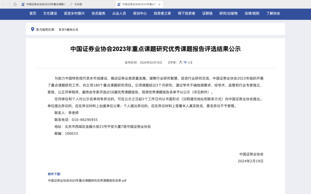 由中国证券业协会组织开展的2023年度课题研究工作共立项180个重点项目,通过学术不端检测、专家网上初审和答辩终审等环节,最终由专家评选出56篇优秀课题。