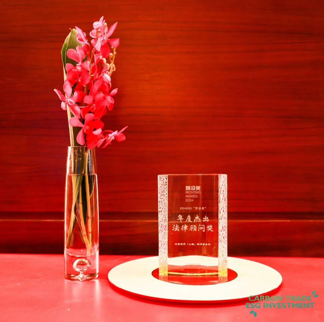 2024年3月28日,在刚刚落幕的“第四届中国碳交易与ESG投资发展大会”暨“2024中国ESG前沿奖颁奖典礼”上,vsport体育双碳及ESG团队在和全国第一梯队的ESG知名投资机构、金融机构、上市公司、各类企业、律师事务所、会计师事务所等专业机构的激烈角力过程中,凭借其出色的业绩表现、优质的专业服务和强大的市场影响力胜出,成为荣获“2024中国ESG前沿奖-年度杰出法律顾问”大奖的唯一律师事务所!