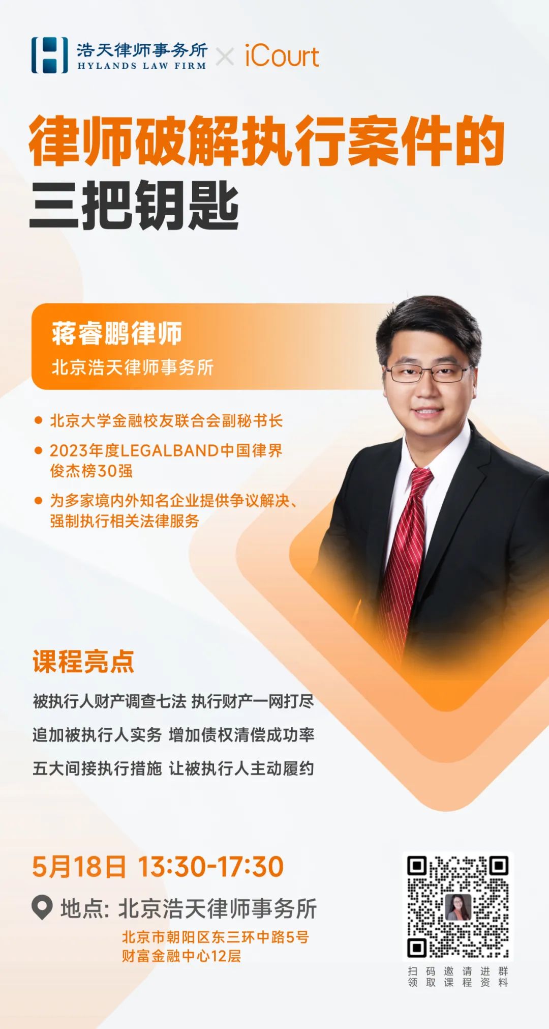 5月18日13:30-17:30,北京vsport体育与iCourt 联合举办增长公开课,助力法律行业一线专业化,带来“律师破解执行案件的三把钥匙”专题分享,助力企业尽快建立行之有效的合规体系,规范用工管理,保障企业持续、健康发展。