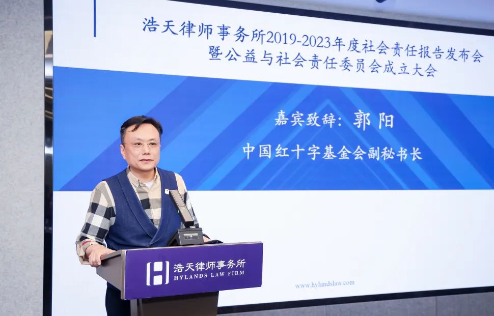 中国红十字基金会副秘书长郭阳在致辞中强调:浩天在不断精进和发展业务的同时,没有忘记作为法律人的社会责任,作为一家具有社会责任感的律师事务所,其初心始终未改。多年来,浩天始终坚持以党建引领所建,切实加强律师队伍的政治素养,积极参政议政,推进法治建设,充分发挥专业优势,助力国家项目建设,改善营商环境,服务乡村振兴,助力经济发展,并积极投入公益慈善事业,为处于困境中的人们送去温暖,为公益慈善事业的健康发展保驾护航。中国红十字基金会是浩天的公益合作伙伴,2021年中国红十字基金会与浩天北京总所签署了风险合规战略合作协议,这是律师行业与公益行业合作模式的新尝试,浩天以其精湛的专业能力和丰富的执业经验,为中国红十字基金会建立和健全合规风控建设体系和制度,更为中国公益行业的合规与风控工作树立了新的标杆。最后,郭阳副秘书长谨代表中国红十字基金会预祝本次发布会圆满成功,期待双方能够不断探索新的合作模式,共同推进公益慈善事业的健康发展。