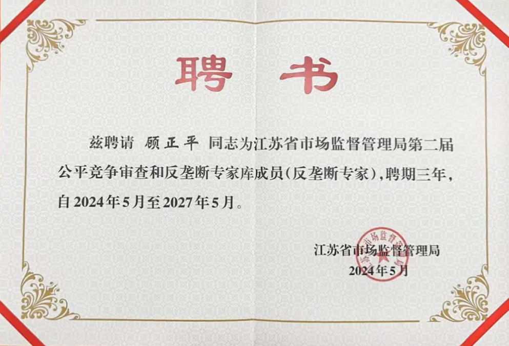 顾正平律师将与其他专家一起,积极履行专家职责,为江苏省市场监督管理局提供专业和高效的支持,切实完成各项受托事项,助力江苏省营造更加优良的公平竞争营商环境。