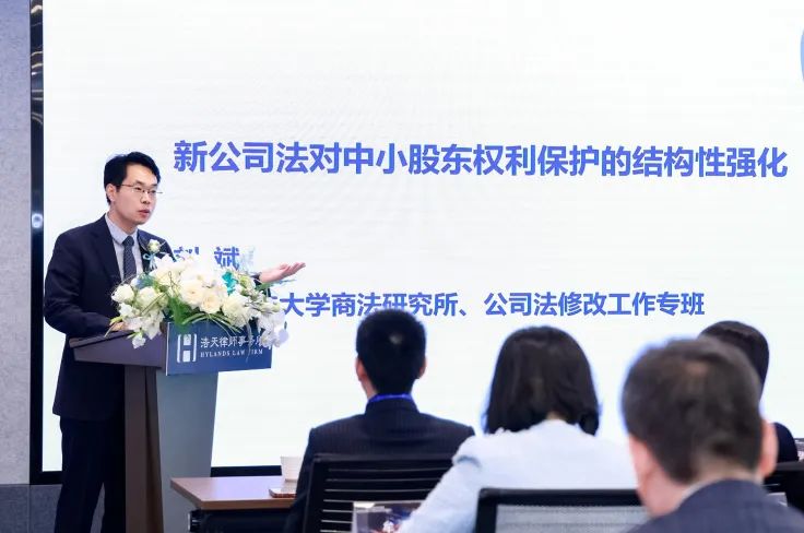 在主题演讲环节,中国政法大学教授、公司法修改工作专班成员刘斌教授以《新公司法对中小股东权利保护的结构性强化》为题,发表了深入浅出的演讲。刘斌教授从股权的确权规则、出资责任、股东压制回购请求权、异议回购请求权、知情权、股东双重代表诉讼、同比例减资条款适用等方面,紧紧围绕实务中痛点提炼出新公司法对中小股权权利保护的制度性突破。