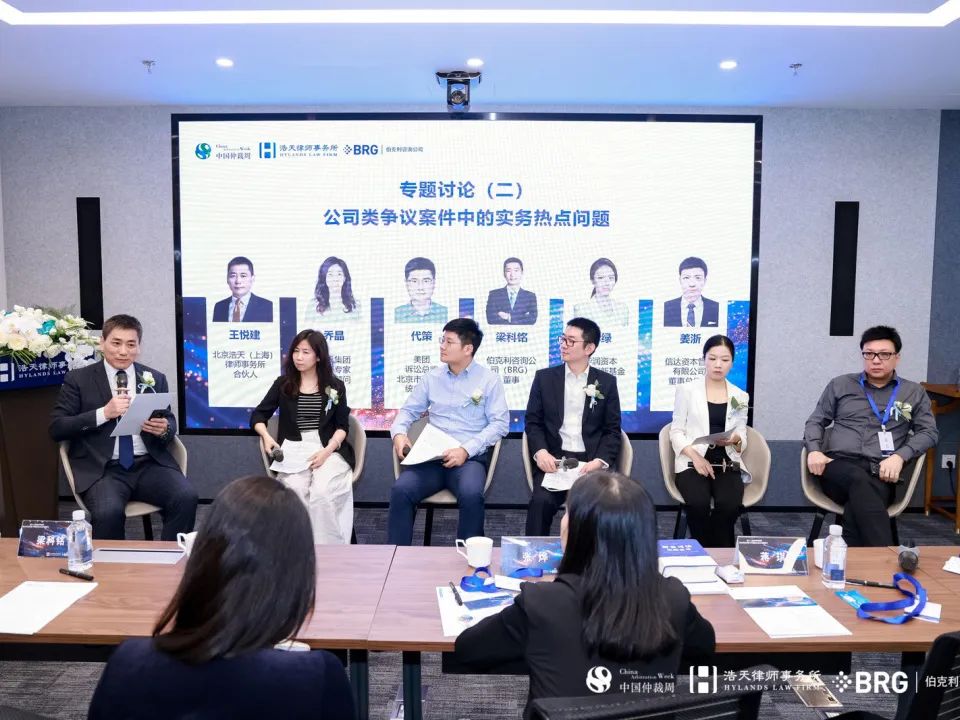 圆桌讨论(二)以“公司类争议案件中的实务热点问题”为主题,由北京浩天(上海)律师事务所高级合伙人王悦建律师主持,嘉宾包括腾讯集团资深专家法律顾问乔晶、美团诉讼总监、北京市法院系统前法官代策、伯克利咨询公司(BRG)董事梁科铭、华润资本/华润国新基金董事毕绿、信达资本管理有限公司董事总经理姜浙。