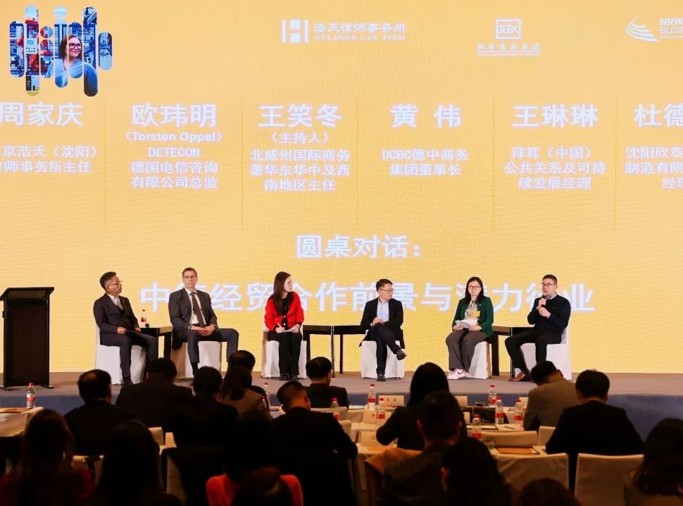 同时中德与会嘉宾就“中德经贸合作前景与潜力行业”进行交流。在圆桌对话环节中,北京浩天(沈阳)律师事务所主任周家庆,拜耳(中国)有限公司公共关系及可持续发展经理王琳琳,沈阳欣泰隆机械制造有限公司总经理杜德顺,DCBC 德中商务集团董事长黄伟以及德国电信咨询有限公司总监Torsten Oppel先生,在北威州国际商务署华东华中及西南地区主任王笑冬主持下,就德中经贸投资合作的话题展开了自由对话,结合当前国际经济环境、经贸合作产业、跨文化商务交流等话题进行了一系列富有启发性的讨论,令到场的中德国际经贸业内嘉宾收获满满,现场掌声阵阵。