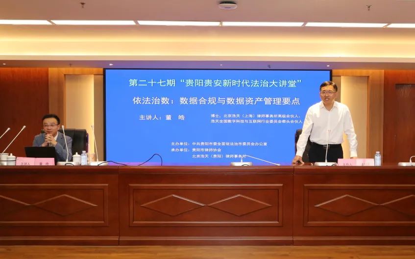 中共贵阳市委依法治市办举办的第二十七期“贵阳贵安新时代法治大讲堂”由贵阳市律师协会与北京浩天(贵阳)律师事务所联合承办,于7月17日在贵阳市行政复议中心进行。讲座由市委依法治市办常务副主任、市司法局局长张明勇主持并致辞,北京vsport体育全国数字科技与互联网行业委员会牵头合伙人、浩天上海办公室高级合伙人董皓博士主讲,贵阳贵安有关单位、有关企业及律师代表共计160余人参加。