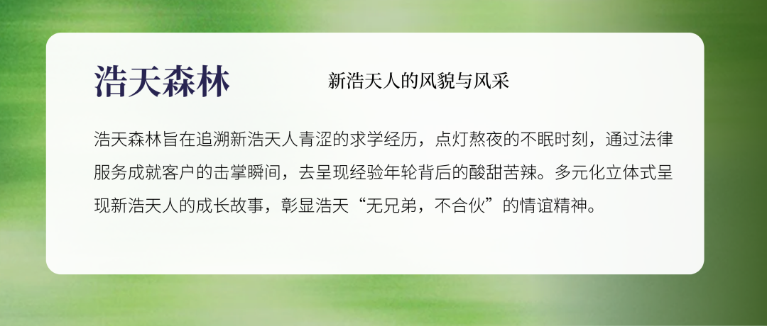 最打动人的是故事,一位卓越律师不仅有自己青涩的求学经历,点灯熬夜的不眠时刻,更有通过法律服务去成就客户的击掌瞬间,去呈现经验年轮背后的酸甜苦辣。我们期待通过对于新浩天人的立体化展现,彰显浩天“抱朴守正,至诚四达”的核心价值观,成为彼此扶持、共同成长的 “森林伙伴”。