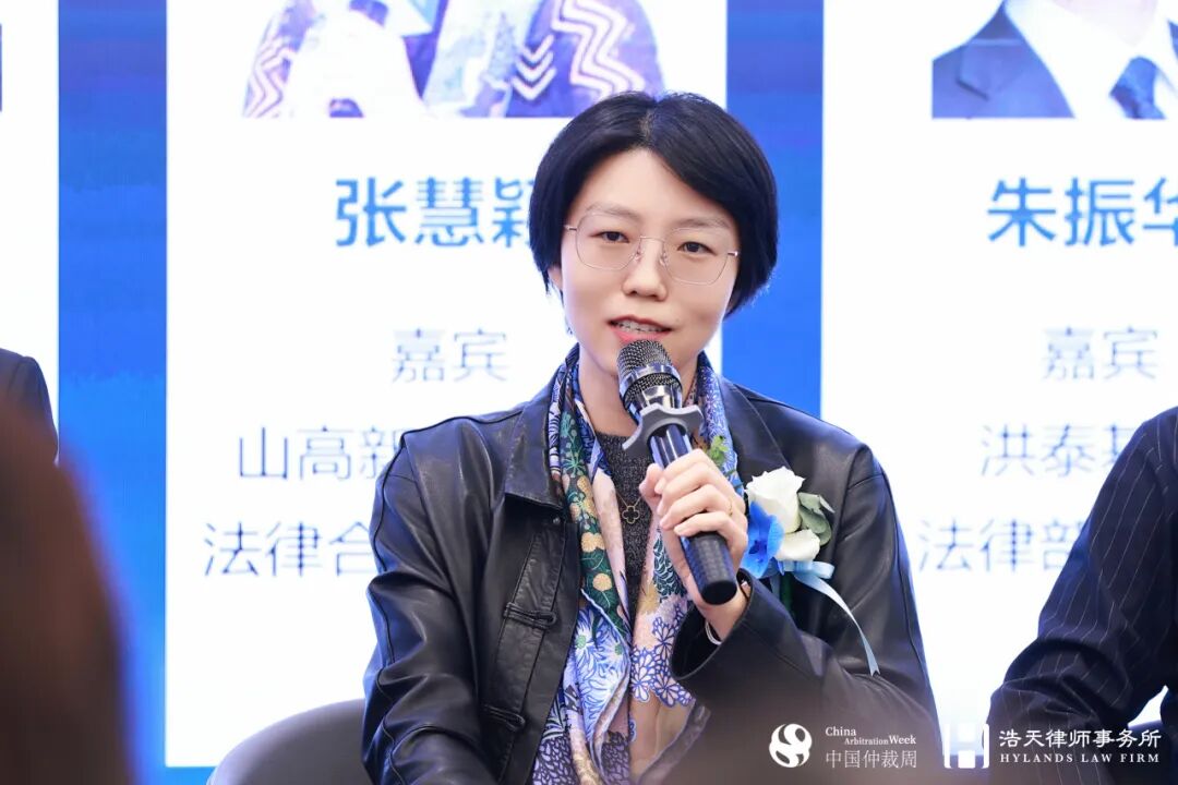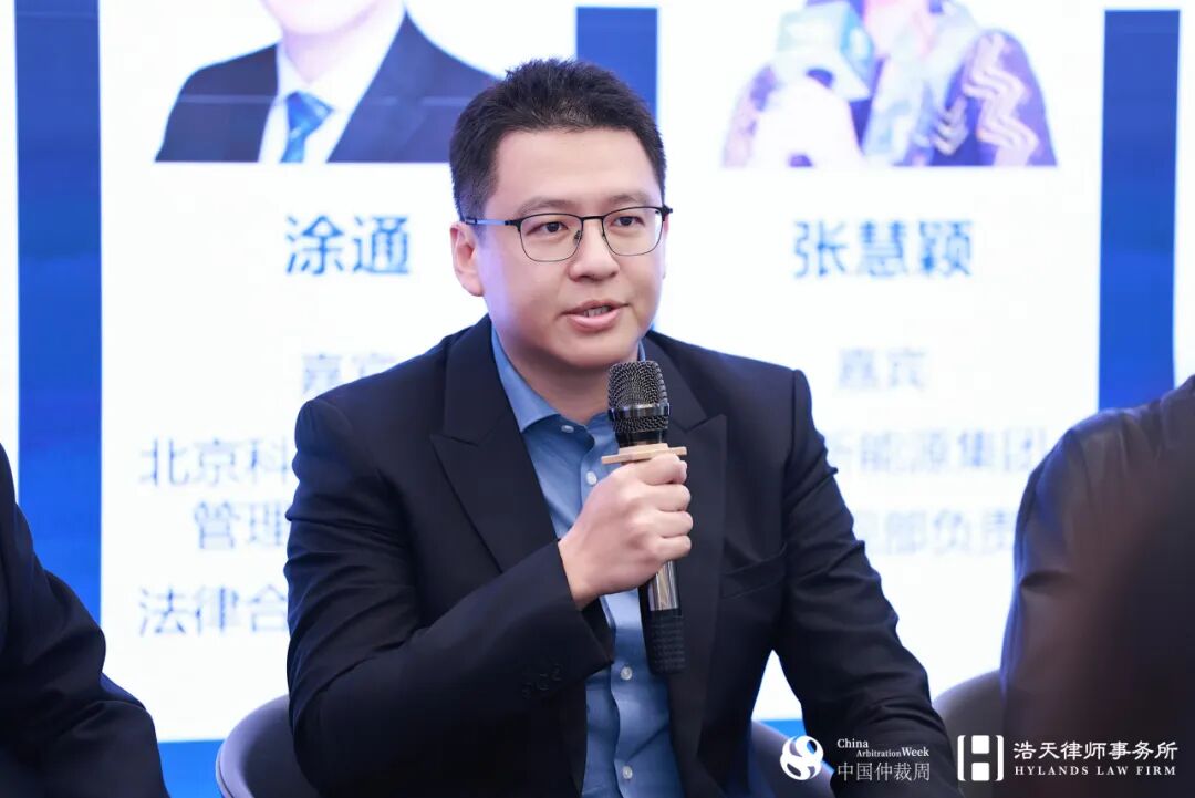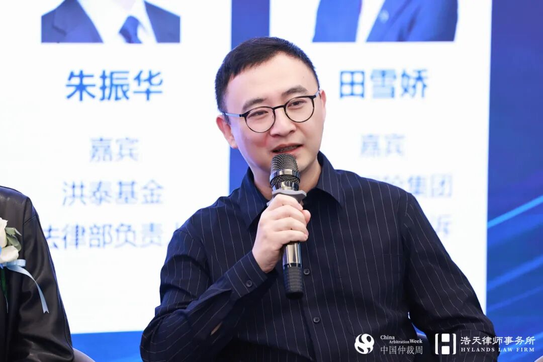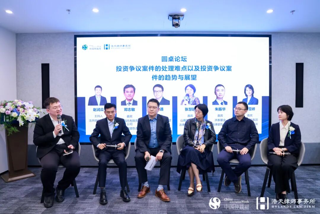 茶歇结束后,会议进入圆桌论坛环节。在浩天研究院院长赵润众的主持下,中诚信托有限责任公司法律合规部负责人邓志敏、北京科技创新投资管理有限公司法律合规部负责人涂通、山高新能源集团法律合规部负责人张慧颖、洪泰基金管理合伙人朱振华、泰康保险集团法律合规部诉讼案件主管田雪娇等企业法务专家,就“投资争议案件的处理难点以及趋势展望”展开深入讨论。