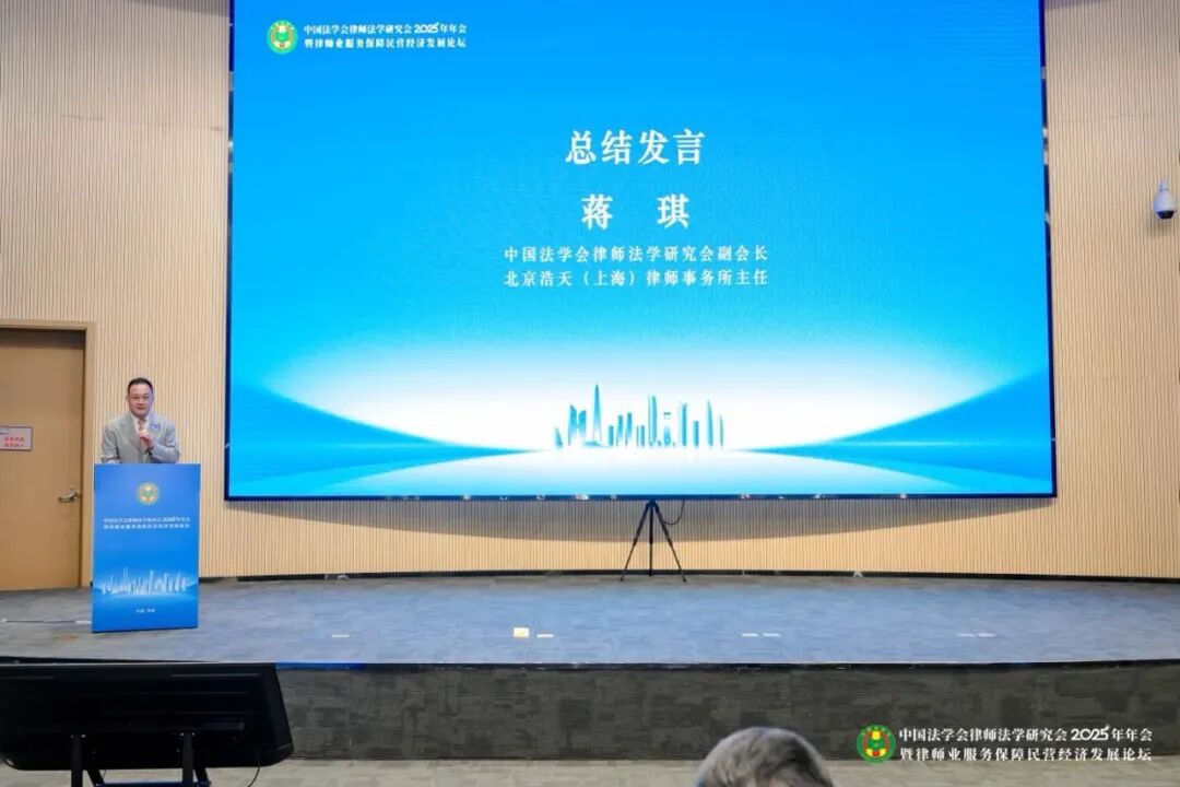 中国法学会律师法学研究会副会长、北京浩天(上海)律师事务所主任蒋琪律师受邀出席论坛并作大会总结发言。蒋琪律师在发言中高度评价本次会议的价值,指出论坛内容兼具理论深度与实践温度,既包含对民营经济法治保障的理论剖析,也涵盖律师服务实践的经验总结,更有对行业未来发展的前瞻思考,真正实现了“理论与实践同频、学界与业界共振”。