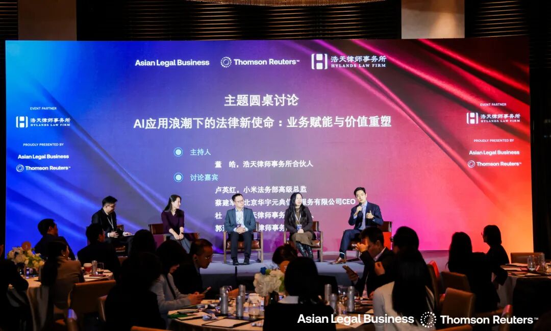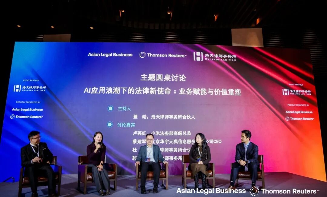 庆典活动继而进入圆桌讨论环节,主题为“AI应用浪潮下的法律新使命:业务赋能与价值重塑”。由北京浩天(上海)律师事务所合伙人董皓律师作为主持人,邀请到小米法务部高级总监卢英红女士、北京华宇元典信息服务有限公司CEO蔡建军先生,以及北京vsport体育两位合伙人杜帅律师、郭远程律师参与分享。