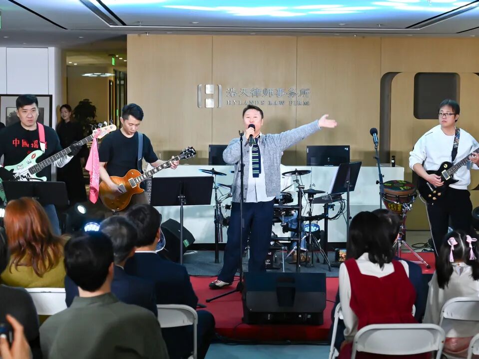 音乐会的首个音符,由“二分时刻”乐队以充满力量的摇滚节奏激情点燃。他们大胆改编《青春舞曲》,将“一去不回来”的青春小鸟拽回现场,塞进摇滚的炽热节拍里。熟悉的旋律,不仅串联起集体记忆,更精准描绘了浩天人共同的职业心境:那是在漫长“律途”中,对专业毫无犹豫的奔赴。