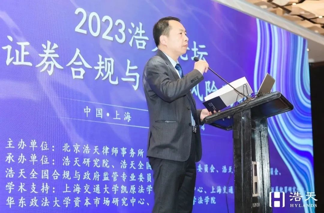 北京浩天(上海)律师事务所高级合伙人、浩天全国资本市场专业委员会牵头合伙人、上海市律师协会金融工具业务研究委员会主任朱峰就《全面注册制背景下证券合规体系建设之道》进行主题发言,强调证券资本市场已经步入了强监管时代,在新形势下,强监管时代上市公司合规风险加大,而证券合规体系建设迫在眉睫。
