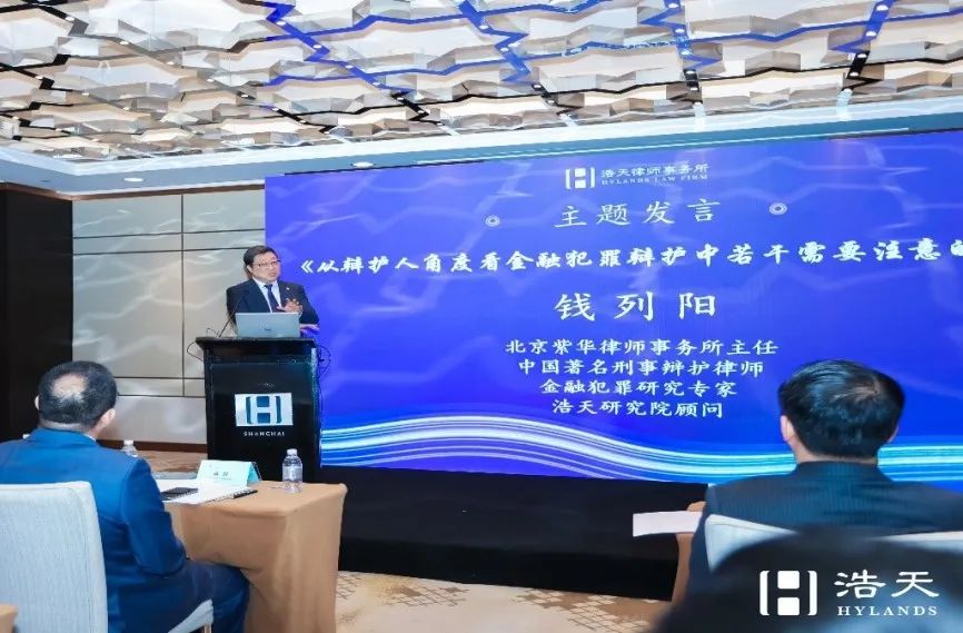 北京紫华律师事务所主任、中国著名刑事辩护律师、金融犯罪研究专家、浩天研究院顾问钱列阳就《从辩护人角度看金融犯罪辩护中若干需要注意的问题》进行主题发言。钱列阳律师谈到,对于立志想要从事金融犯罪案件辩护工作的刑事律师来说,挡在我们面前的一座大山就是各种金融交易结构、金融术语等金融知识、理论与思维,我们应当从办理的一个个案子中持续学习金融理论知识,在实践中不断成长。此外,钱律师还谈到,律师在办理金融犯罪案件时有一个很重要的点就是要尽可能的让自己与当事人处于一个同频的状态。因为金融犯罪案件的当事人都有一个显著的特点,就是都是金融领域的大行家,甚至是金融法律法规的专家,但他们大多对《刑法》都处于一知半解的状态,这就需要刑事律师在他们的金融语境下,跟他们讲《刑法》的相关规定,给他们解析他们的行为是否构成犯罪等,从而争取与当事人对案件达成一致的认知。律师的主要专业技能是读人,只有读通读透那些金融专家当事人们的心,理解他们的金融思维,才能更好地与他们沟通,更好地维护他们的合法利益。另外,钱律师还谈到了律师从事合规业务时要把握好服务的边界和尺度,既要尽到职责,又要防范越位过界。最后,钱律师还给大家介绍了对高频交易、量化交易等新型金融犯罪案件如何正确理解与规制的掌握方式。