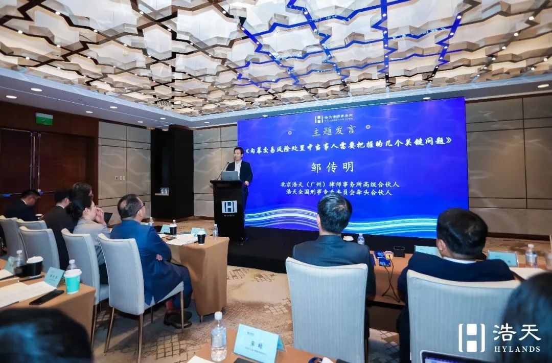 北京浩天(广州)律师事务所高级合伙人、浩天全国刑事专业委员会牵头合伙人邹传明就《内幕交易风险处置中当事人需要把握的几个关键问题》进行主题发言,邹律师从当事人角度出发,着重强调在内幕交易风险处置中的自首情节的重要性,强调内幕交易当事人要清醒认识其面临的总体形势的变化。