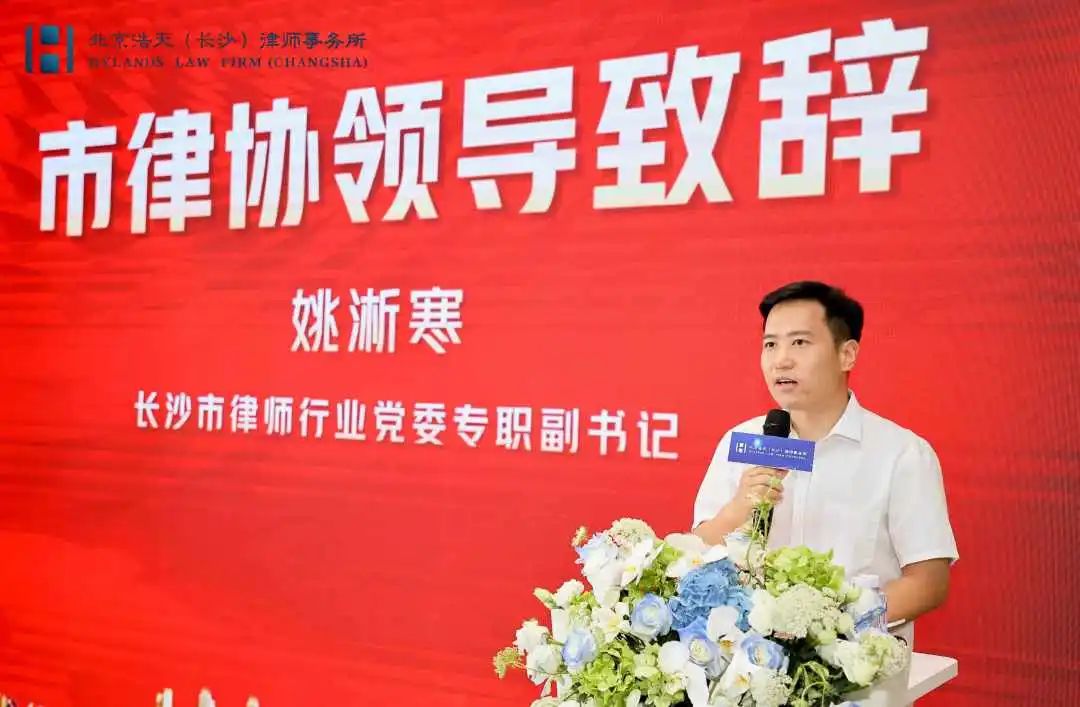 长沙市律师行业党委专职副书记姚淅寒发言致辞。姚书记对浩天长沙办公室八年来的奋斗与发展给予肯定,从信访值班、法律援助、公益讲座,再到乡村帮扶结对,浩天长沙办公室持续为政府机关、社会、客户单位提供优质的法律服务。他祝愿浩天长沙办公室坚持政治引领,深耕业务领域、守正创新,打造长沙精品律所,为维护社会公平正义贡献专业力量。