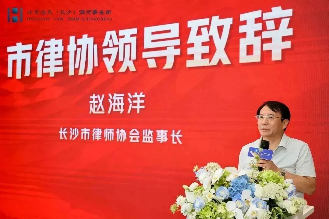 长沙市律师协会监事长赵海洋发言致辞。赵监事长代表长沙市律协对浩天长沙办公室的乔迁送上美好祝福。他强调法律职业共同体建设对长沙律师行业的发展的重要意义,长沙市律师协会将继续支持广大律师们的工作,共同促进长沙律师行业更上台阶。