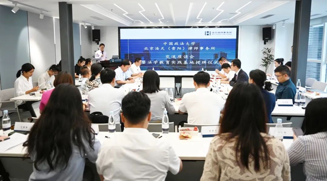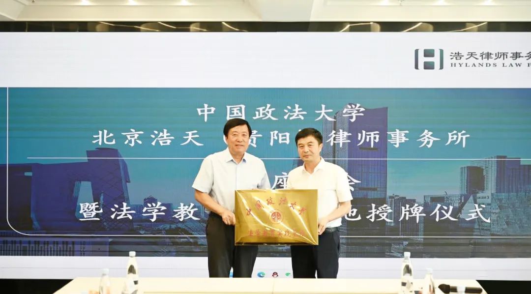 2023年7月7日下午,中国政法大学党委常委、副校长冯世勇携学校相关部门及部分学院负责同志、优秀青年教师等一行22人到访北京浩天(贵阳)律师事务所,开展座谈交流暨中国政法大学“法学教育实践基地”授牌仪式。