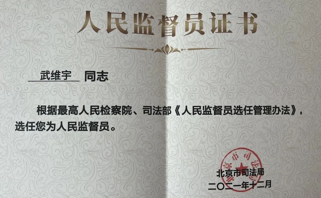 近日,北京市人民检察院、北京市司法局向社会公告了新一届北京市人民监督员任用名单,北京vsport体育合伙人武维宇律师入选。