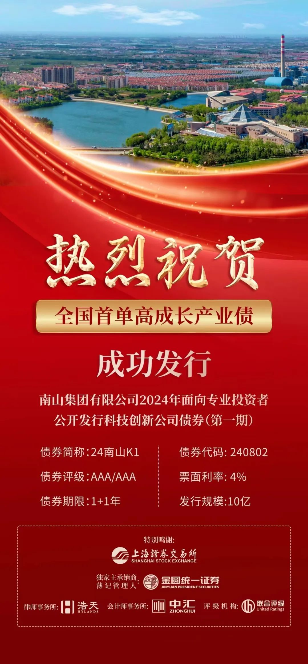 本期债券规模10亿元,发行期限为1+1年期。作为全国首单高成长产业债,本期债券受到广泛关注,银行理财、公募及私募基金、券商自营及资管、信托等不同类型市场主体踊跃参与。票面利率4%,为同期限民营企业最低利率。全国首单高成长产业债的成功发行,离不开上交所的指导,也体现了投资者对南山集团科技创新属性及行业地位的认可。未来,南山集团将继续贯彻发挥债券市场服务实体经济、推动中国经济高质量发展的政策精神,在“整合、优化、创新、提升、发展”企业理念引领下,进一步发挥自身优势、整合资源,助力科技创新和产业升级。