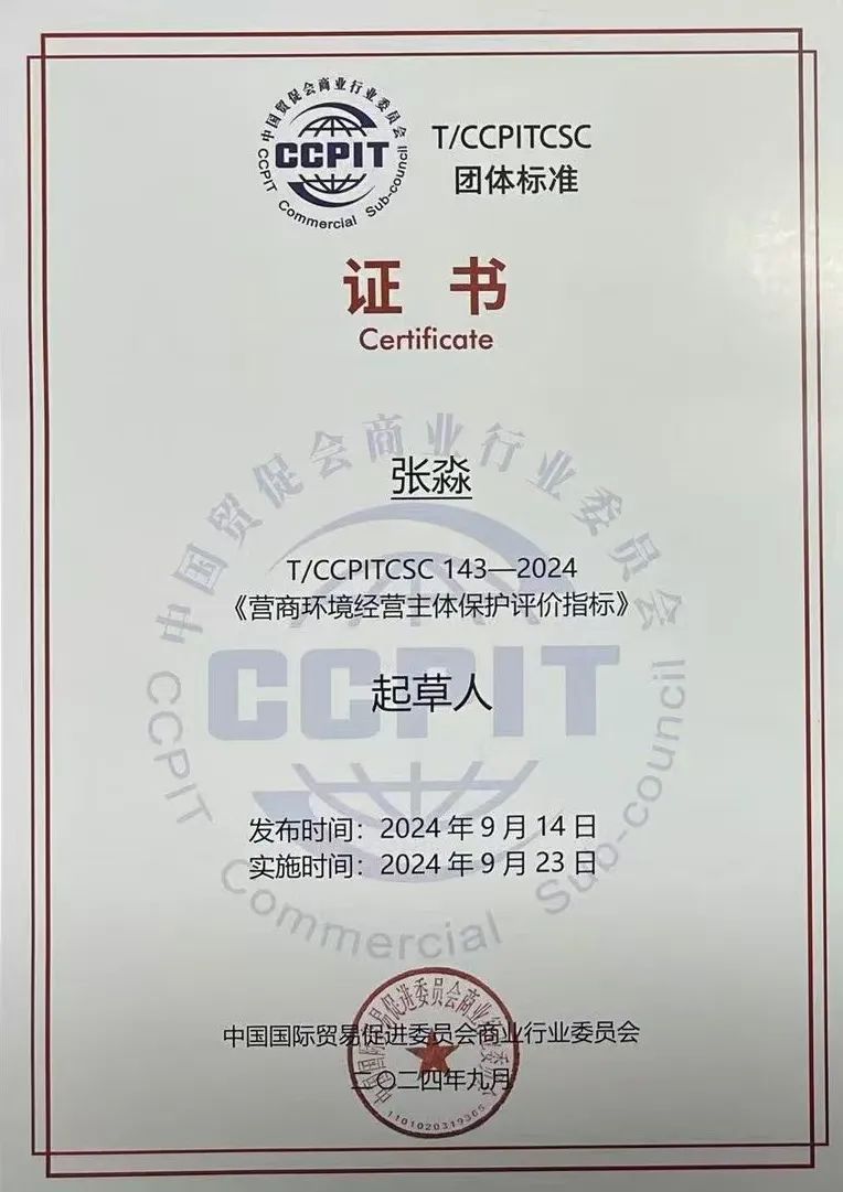日前,由中国国际贸易促进委员会商业行业委员会组织编制的《优化营商环境经营主体保护评价指标》(T/CCPITCSC 143-2024)正式发布,自2024年9月23日起实施。