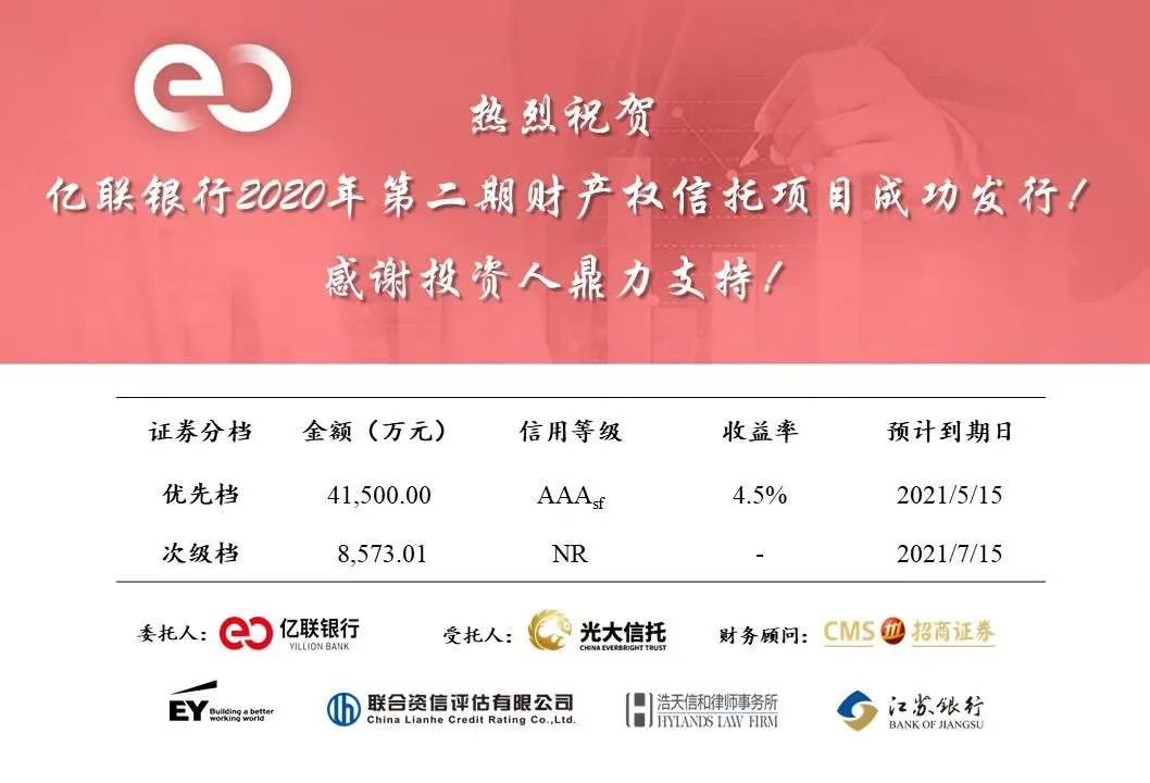 这是亿联银行财产权信托第四次成功发行。本次财产权信托亿联银行作为委托人,将其优质消费信贷资产(正常类)委托给光大兴陇信托有限责任公司,设立“亿联银行2020年第二期财产权信托计划”,资产规模为5亿元人民币。信托单位分为优先档和次级档,其中优先档信托单位评级为AAAsf,预期收益率为4.5%,预计到期日为2021年5月15日。