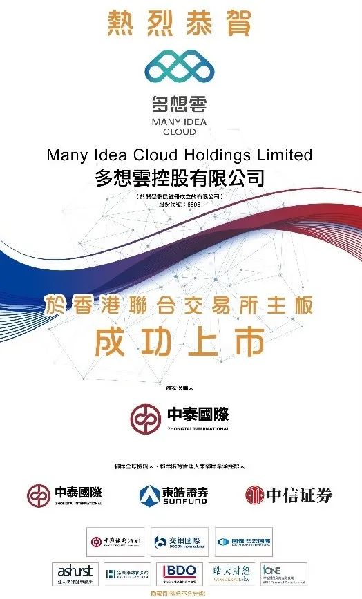 2022年11月9日,多想云控股有限公司(Many Idea Cloud Holdings Ltd,“多想云”)在香港联合交易所有限公司主板正式挂牌上市,股票代码为:06696.HK。