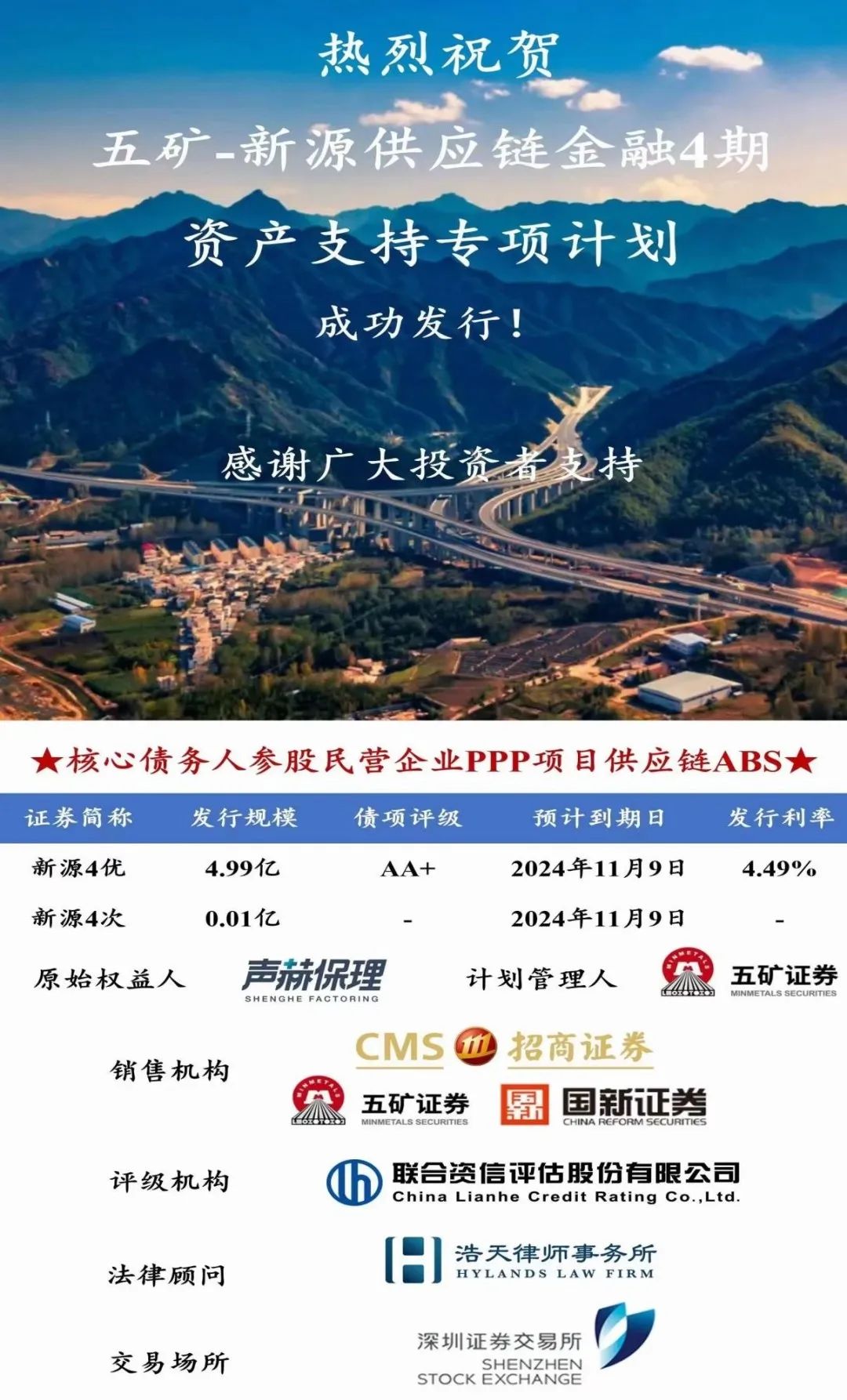 2022年11月4日,“五矿-新源供应链金融4期资产支持专项计划”于深圳证券交易所成功发行。本期项目采用“N+N+N”形式发行,产品期限2年。
