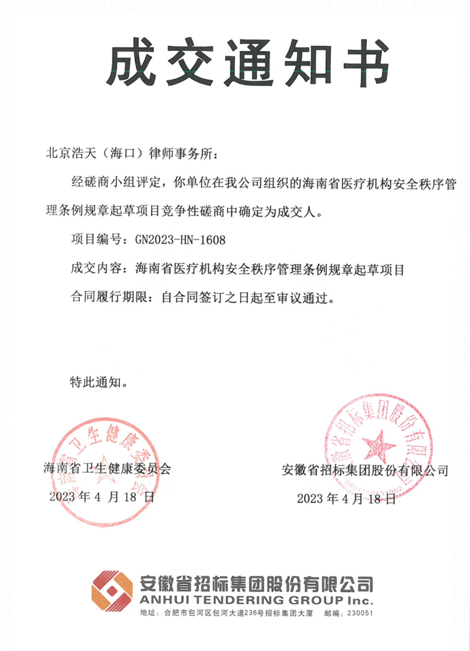 近日,浩天健康与生命科学行业委员会与北京浩天(海口)律师事务所联动,成功中标海南省人民政府“《海南医疗机构安全秩序管理条例规章》起草项目”标段。