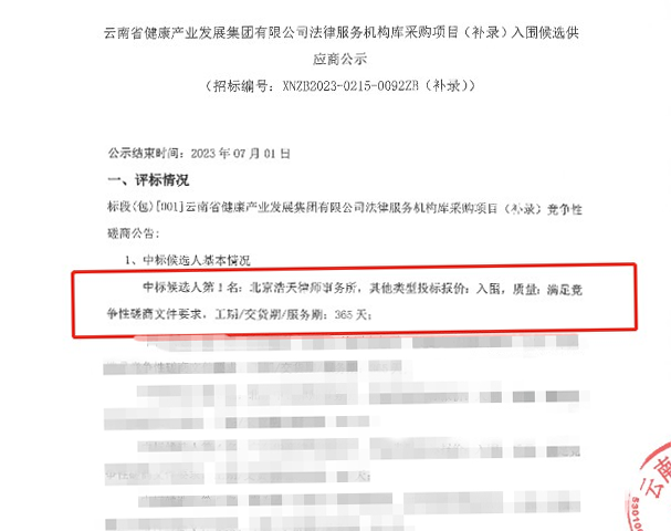 2023年7月3日,北京vsport体育(以下简称"浩天")在与多家享誉业内的知名律所的激烈角逐中,凭借卓越的业绩、优秀的团队、专业的服务方案,在浩天中台的协助下,经过评标专家的初步评审、磋商、详细评审等综合评审,以综合得分第一名的成绩成功入围“云南省健康产业发展集团有限公司法律服务机构库采购项目”。