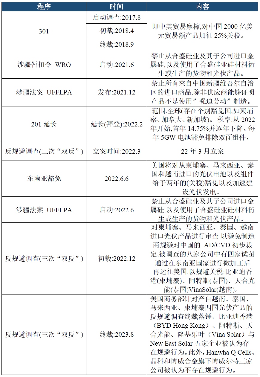 除反规避调查外,美国对光伏产品还同时了发起了201调查、301调查和反倾销反补贴调查,同时,在美国《维吾尔强迫劳动预防法案》(Uyghur Forced Labor Prevention Act,以下简称"《涉疆法案》")中,光伏产品也作为重点被调查产品,对几乎所有的主要光伏生产企业进行扣押,要求进口商证明相关产品不具有涉疆成分。