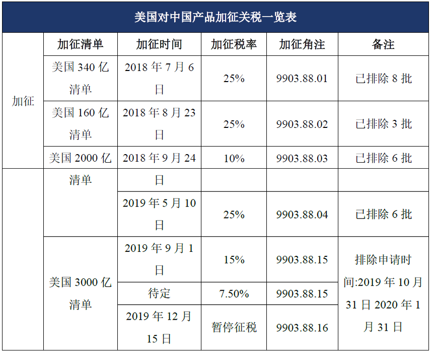 2018年7月6日,美国贸易代表公布了针对上述340亿美元征税产品的豁免办法,制定了对某一特定产品排除301程序关税的规则。7月11日,该排除规则被正式公布于《联邦公报》。产品排除的申请截止日10月9日。