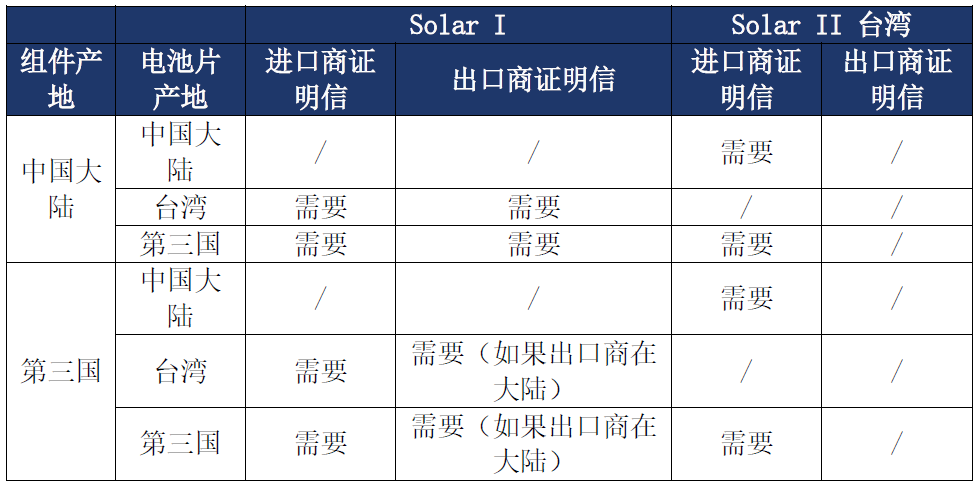 1.使用的是台湾生产的电池片时,需要出具以上(一)①Solar I中适用的证明信;