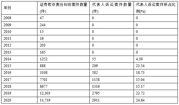 2008~2020年代表人诉讼案件数量及占比情况