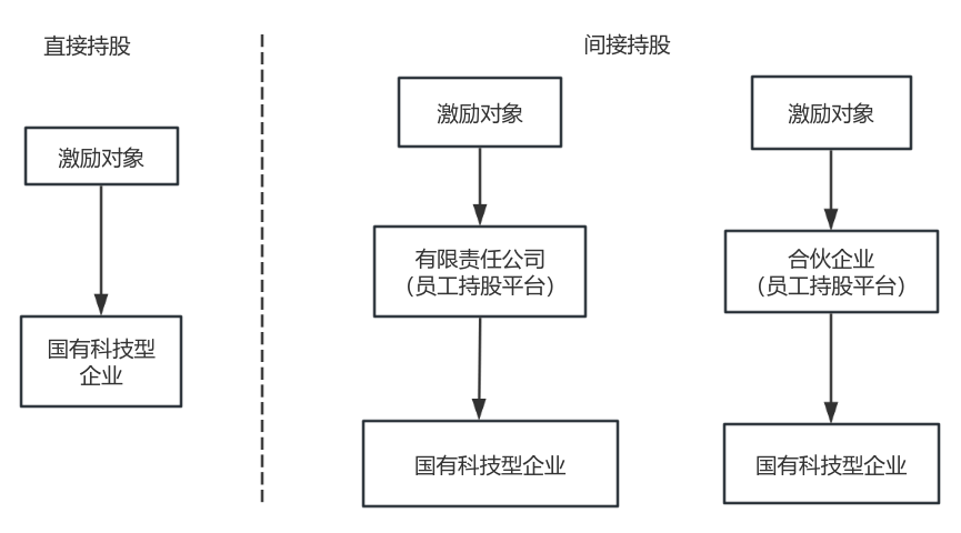 激励对象持有激励股权有直接持股或间接持股两种方式。激励对象可以采用直接持有激励股权;也可以通过设立有限责任公司或合伙企业持股平台,采用间接持股的方式持有激励股权。两种持股方式具体图示如下:
