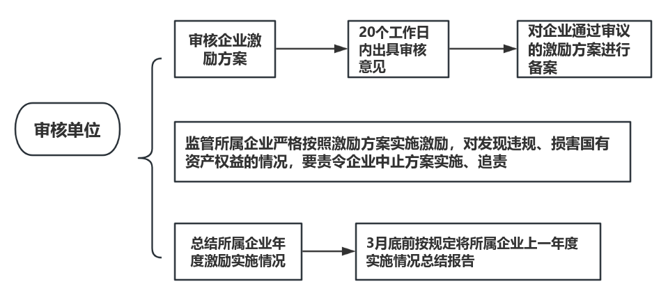 审核单位是指履行出资人职责或国有资产监管职责的部门、机构、企业。即中央企业集团公司相关材料报履行出资人职责的部门或机构批准;中央企业集团公司所属子企业,相关材料报中央企业集团公司批准;履行出资人职责的国有资本投资、运营公司所属子企业,相关材料报国有资本投资、运营公司批准;中央部门及事业单位所属企业,按国有资产管理权属,相关材料报中央主管部门或机构批准;地方国有企业相关材料,按现行国有资产管理体制,报同级履行国有资产监管职责的部门或机构批准。审核单位的职责主要如下图所示: