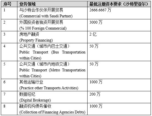 对于有限责任公司,目前没有法定的最低注册资本要求,但实践中,MISA一般要求外国投资者投资的LLC的最低注册资本为50万沙特里亚尔。在某些特定的行业,MISA有更高的注册资本要求,具体如下:
