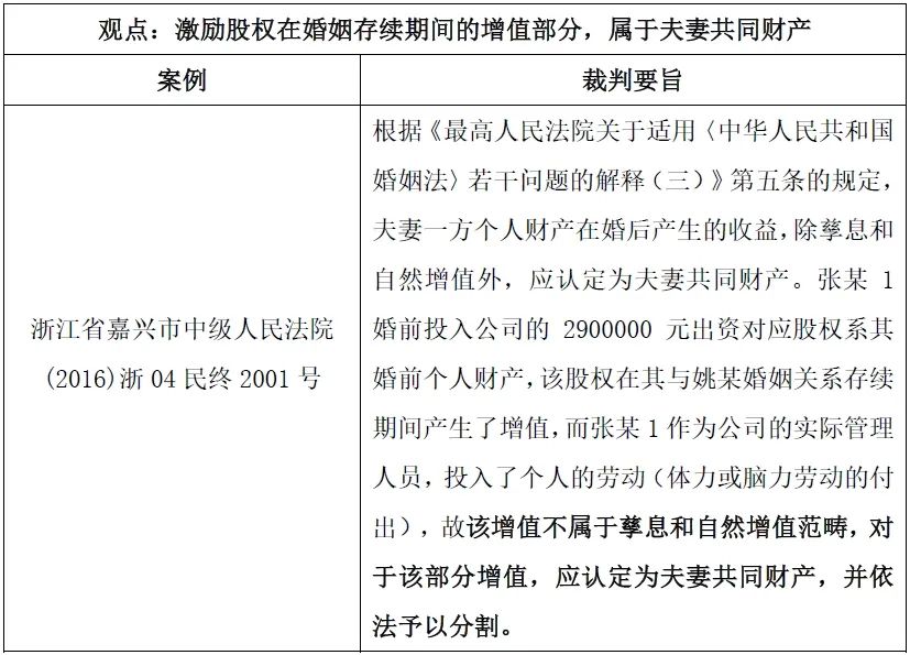 2.如果激励对象在婚前获授激励股权,且在婚前行权,但激励对象持有的激励股权在婚姻存续期间产生增值,由于激励对象投入较多的时间和精力,因此该增值部分不属于孳息和自然增值范畴,应认定为夫妻共同财产。