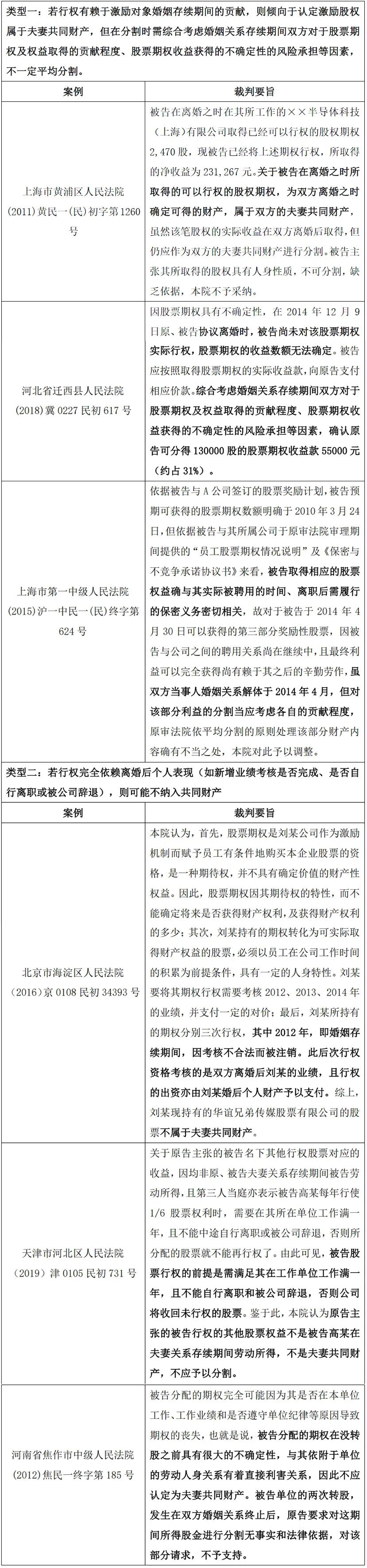 对于该种情形,实践中通常会结合婚姻关系存续期间与授予时间、行权时间是否重合来综合判断是否属于夫妻共同财产。