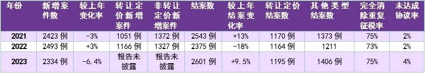 《2023年MAP统计数据》报告[7]显示,2023年全球新增MAP案件2,334例,较2022年下降6.4%,结束了连续多年的增长趋势。全年结案2,601例,较2022年增长9.5%,其中转让定价案件结案1,195例,其他类型案件结案1,406例。OECD指出,结案数回升主要因各国优先处理积压案件,尤其是2016年前的“旧案件”占比从2022年的19%降至16%。本年度新增和结案案件中,转让定价仍是主要争议类型,但非转让定价案件(如常设机构认定、预提税争议)占比上升,反映跨国企业对税收协定条款适用的关注度提高。