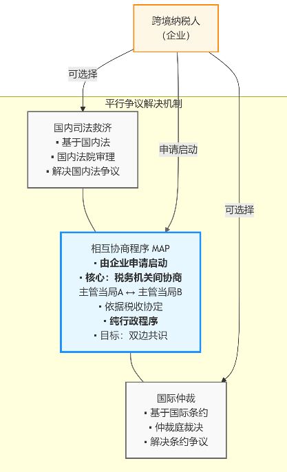 MAP的本质是由跨境纳税人(企业)主动申请发起的、旨在解决国际税收争议的专属机制。其核心运行逻辑植根于国家间税务机关(主管当局)的直接沟通与行政协调。当企业认为其在缔约国另一方遭受了不符合税收协定规定的征税时,可向其居民国税务机关提出MAP申请;受理申请的税务机关随后会依据双边税收协定中的MAP条款,主动与缔约国另一方对应的主管税务机关进行正式协商。这一过程完全在国家行政机关层面展开,依赖于两国税务主管当局之间的谈判,以期达成双方都能接受的解决方案。因此,MAP构成了一个独立于国内司法体系(如国内法院诉讼)和国际仲裁机制的平行争议解决渠道。它体现了税收协定框架下特有的、以行政协商为主导的国际税收合作方式,为纳税人提供了一条避免或减轻国际双重征税的替代性救济路径。其与其他救济的关联关系以及运行结果如下图: