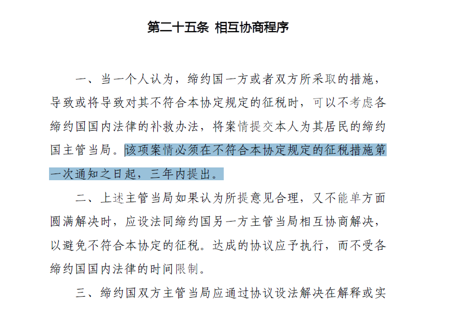 MAP程序的启动存在严格时限要求,如多数税收协定规定申请需在争议发生后3年内提出。如《中华人民共和国政府和沙特阿拉伯王国政府关于对所得和财产避免双重征税和防止偷漏税的协定》第25条第1款约定: