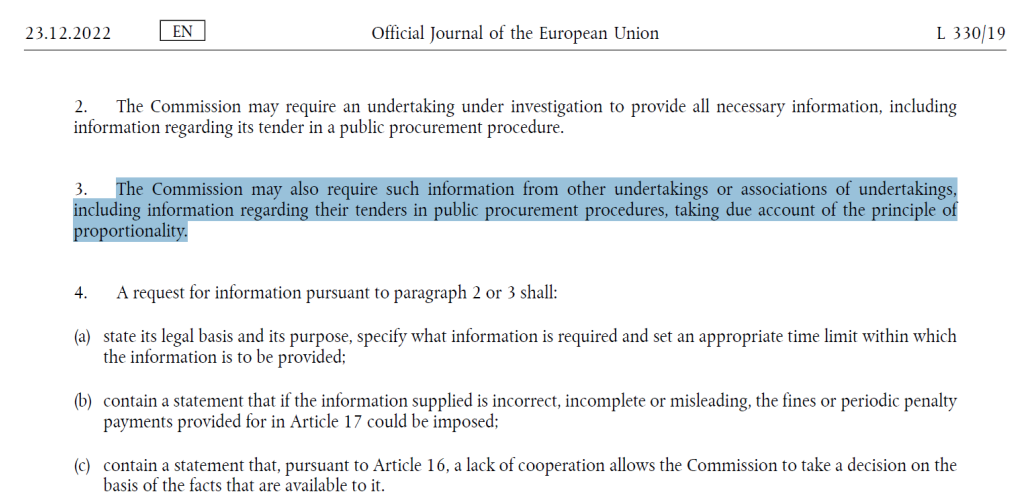该规定中的“other undertakings”为除第13.2款“an undertaking under investigation”以外的企业。此外,从语义分析的角度上看,虽然第13.3款后半句规定了信息调查范围包括该类企业在公共采购申报程序中投标相关信息,但并未明确信息调查范围仅限于此,且根据《外国补贴条例》后文内容,第13.3款同样适用于因并购交易申报与欧委会依职权而引起的调查。因此,银行虽未参加投标,但依然可能经欧委会依据《外国补贴条例》第13.3款纳入信息调查对象企业的范围。