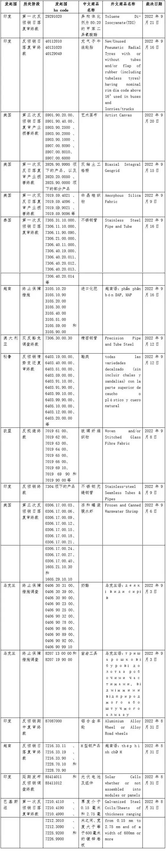 2022年9月贸易救济“出口应诉”动态更新汇总